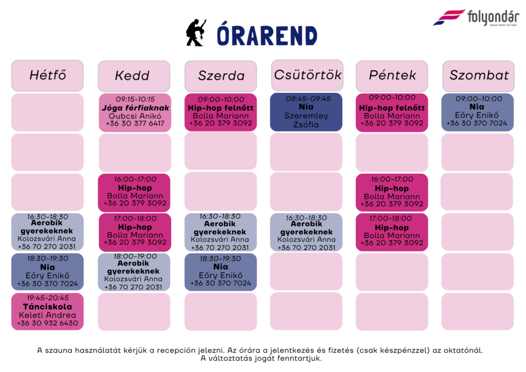 A rendszeres testmozgás az egészséges életmód alapja, mely nem csak a testnek, hanem a léleknek is alapvető szükséglete. Itt a Folyondárban azért vagyunk, hogy segítsünk céljaid megvalósításában, egészséged megőrzésében, mindezt korszerűen felszerelt termekben, igényes környezetben. Célunk az, hogy elégedetten, felfrissülve és önbizalommal telve távozz, alig várva a következő edzést.